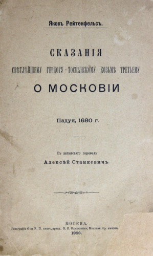 Рейтенфельс, Яков. Сказания светлейшему Герцогу Тосканскому Козьме Третьему о Московии. Падуя, 1680 г. / Яков Рейтенфельс ; иждивением книгопродавца Петра Мария Фрамботти : с разрешения старших ; с лат. пер. Алексей Станкевич. - Москва : Тип. О-ва распростр. полез. кн., арендуемая В.И. Вороновым, 1905