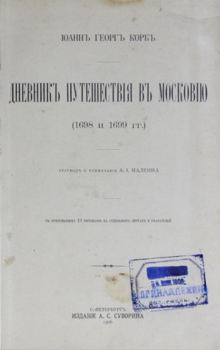 Корб, Иоганн Георг (1670-1741). Дневник путешествия в Московию (1698 и 1699 гг.) / Иоанн Георг Корб ; пер. и примеч. А.И. Малеина. - Санкт-Петербург : Издание А.С. Суворина, 1906