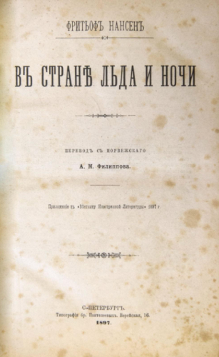 Нансен, Фритьоф (1861-1930). В стране льда и ночи. Т. 1. / Фритьоф Нансен ; пер. с норвеж. А.М. Филиппова, действ. чл. ИРГО. - Санкт-Петербург : Тип. бр. Пантелеевых, 1897