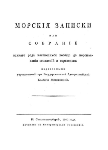 Морские записки, или Собрание всякого рода касающихся вообще до мореплавания сочинений и переводов. [Ч. 1] / изд. учрежд. при Гос. Адмиралтейской коллегии комитетом. - Санкт-Петербург : Имп. тип., 1800