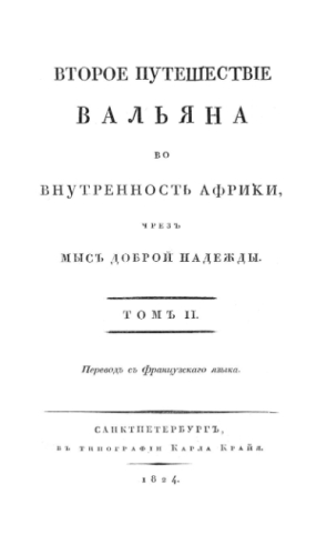 Левайан, Франсуа (1753-1824). Второе путешествие Вальяна во внутренность Африки, через мыс Доброй Надежды. Т. 2. / пер. с фр. яз. - Санкт-Петербург : Тип. Карла Крайя, 1824