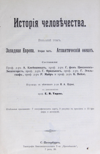 История человечества : Всемирная история. Т. 8 : Западная Европа, Ч. 2 : Атлантический океан / сост. : проф. д-р А. Клейншмидт, проф. д-р Г. фон Цвидинек-Зюденгорст [и др.] ; пер. с нем. д-ва Я.А. Лурье, с доп. проф. Е.В. Тарле. - Санкт-Петербург : Т-во "Просвещение", [1904]