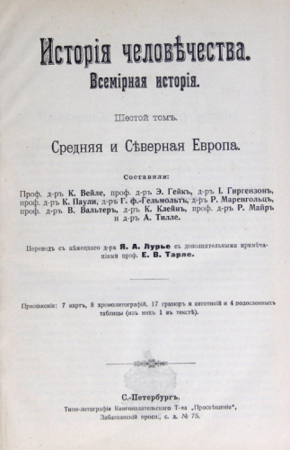 История человечества : Всемирная история. Т. 6 : Средняя и Северная Европа / сост. проф. д-р К. Вейле, проф. д-р Э. Гейк, И. Гиргензон [и др.] ; пер. с нем. д-ра Я.А. Лурье с доп. примеч. проф. Е.В. Тарле. - Санкт-Петербург : Т-во "Просвещение", [1908]
