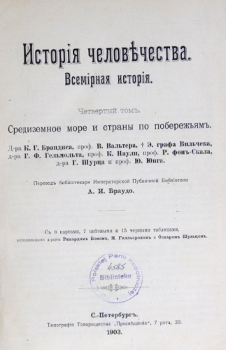 История человечества : Всемирная история. Т. 4 : Средиземное море и страны по побережьям / [соч.] д-ра К.Г. Брандиса, проф. В. Вахтера, Э. графа Вильчека [и др.] ; пер. библ. Публ. б-ки А.И. Браудо. - Санкт-Петербург : Т-во "Просвещение", [1903]