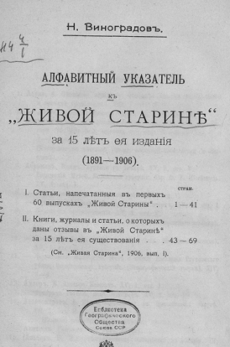 Виноградов, Николай Николаевич. Алфавитный указатель к "Живой старине" за 15 лет ее издания (1891-1906) / Н. Виноградов. - Санкт-Петербург : тип. М-ва путей сообщ., 1910 - (Отд. оттиск из журн.: Живая старина. 1908. № 2; 1909. № 4)