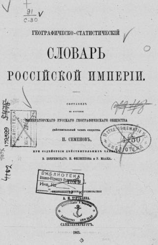 Семенов-Тян-Шанский, Петр Петрович (1827-1914). Географическо-статистический словарь Российской империи. Т. 1. / сост. по поруч. ИРГО действ. чл. О-ва П. Семенов при содействии В. Зверинского, Н. Филиппова и Р. Маака ; ижд. чл.-соревнователя А.Н. Турубаева. - Санкт-Петербург : Тип. Безобразова и комп., 1863