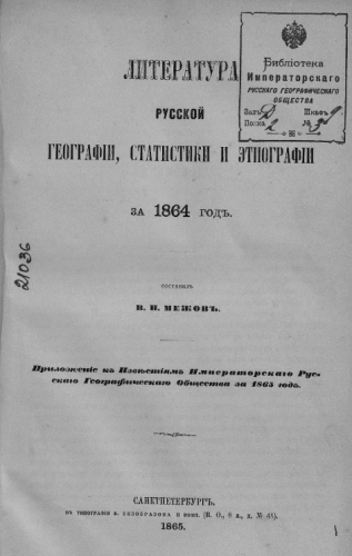 Межов, Владимир Измайлович (1830-1894). Литература русской географии, статистики и этнографии за 1864 год / сост. В.И. Межов ; Приложение к Известиям ИРГО за 1865 год. - Санкт-Петербург : Тип. В. Безобразова и комп., 1865