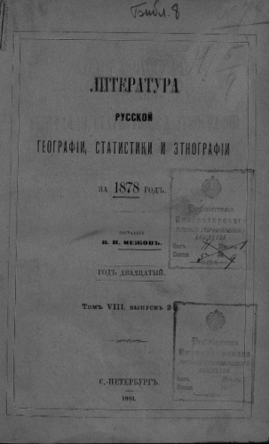 Межов, Владимир Измайлович (1830-1894). Литература русской географии, статистики и этнографии за 1878 год / сост. В.И. Межов. - Санкт-Петербург : Тип. В. Безобразова и комп., 1881