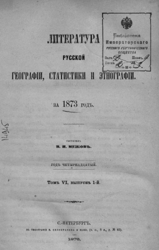 Межов, Владимир Измайлович (1830-1894). Литература русской географии, статистики и этнографии за 1873 год / сост. В.И. Межов. - Санкт-Петербург : Тип. В. Безобразова и комп., 1876 - (Отд. оттиск: Приложение к Известиям ИРГО. Т. XII : 1876)