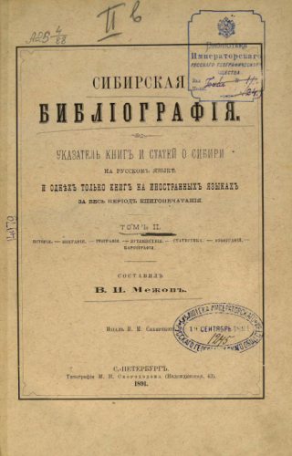 Межов, Владимир Измайлович (1830-1894). Сибирская библиография : указатель книг и статей о Сибири на русском языке и одних только книг на иностранных языках за весь период книгопечатания. Т. 2 : История, Библиография, География, Путешествия, Статистика, Этнография, Картография / сост. В.И. Межов ; изд. И.М. Сибиряков. - Санкт-Петербург : Тип. И.Н. Скороходова, 1891