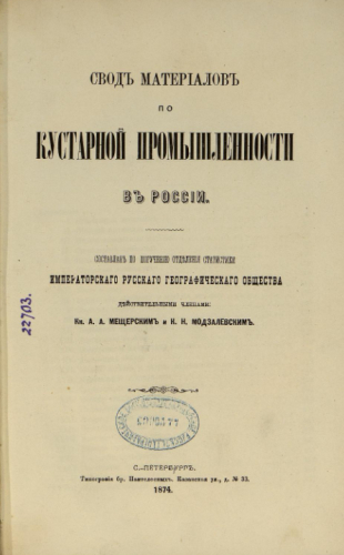 Мещерский, Александр Александрович (1844 - после 1917). Свод материалов по кустарной промышленности в России / сост. по поручению Отд. статистики ИРГО действ. чл. кн. А.А. Мещерским и К.Н. Модзалевским. - Санкт-Петербург : Тип. бр. Пантелеевых, 1874