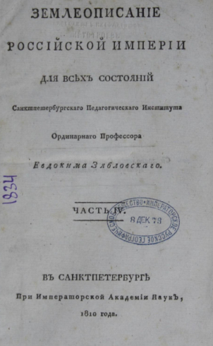 Зябловский, Евдоким Филиппович (1765-1846). Землеописание Российской империи : для всех состояний. Ч. 4. / [соч.] Санкт-Петербургского Педагогического ин-та ординарного проф. Евдокима Зябловского. - Санкт-Петербург : При Имп. Акад. наук, 1810