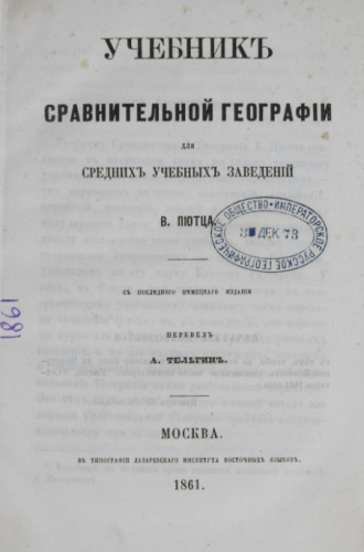 Пютц, Вильгельм (1806-1877). Учебник сравнительной географии для средних учебных заведений / [Соч.] В. Пютца ; с послед. нем. изд. пер. А. Телегин. - Москва : Тип. Лазаревского ин-та восточных языков, 1861