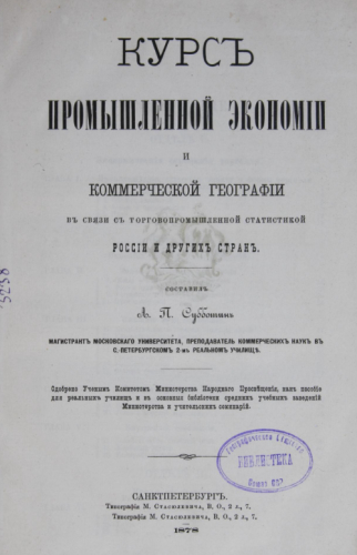 Субботин, Андрей Павлович (1852-1906). Курс промышленной экономии и коммерческой географии в связи с торгово-промышленной статистикой России и других стран / сост. А.П. Субботин, магистрант Моск. ун-та, преподаватель коммерч. наук в С.-Петерб. 2 реал. уч-ще. - Санкт-Петербург : Тип. М. Стасюлевича, 1878