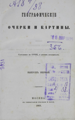 Географические очерки и картины. Вып. 1 : Север. Венгрия и Богемия. Альпы / сост. по Грубе и др. источникам.- Москва : Тип. Грачева и комп., 1861