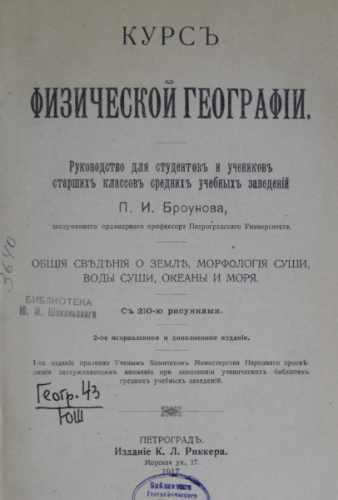 Броунов, Петр Иванович (1853-1927). Курс физической географии : руководство для студентов и учеников ст. классов средних учеб. заведений : общие сведения о земле, морфология суши, воды суши, океаны и моря / [соч.] П.И. Броунова, засл. ординар. проф. Петроградского ун-та. - 2-е изд., испр. и доп. - Петроград : Изд. К.Л. Риккера, 1917