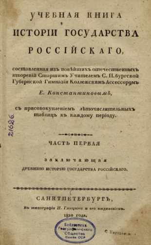 Константинов, Егор Константинович. Учебная книга истории Государства Российского. Ч. 1 : Заключающая древнюю историю Государства Российского / Сост. из новейших отечественных творений ст. учителем Санкт-Петербургской губернской гимназии коллежским ассессором Е. Константиновым. - Санкт-Петербург : Тип. И. Глазунова и его иждивением, 1820