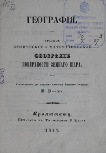 География : краткое физическое и математическое обозрение поверхности земного шара / сост. для первых кл. уезд. уч-ща Ф. Р-м. - Кронштадт : Тип. В. Керра, 1844
