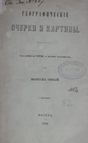 Географические очерки и картины. Вып. 5 : Константинополь - Иерусалим. Аравия. Варварийские владения. Сахара - От мыса Доброй Надежды до острова Явы. Египет. Негритянское королевство Ашантиев / сост. по Грубе и др. источникам. - Москва : Тип. Ф.Б. Миллера, 1862