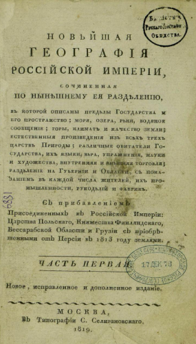 Зябловский, Евдоким Филиппович (1765-1846). Новейшая география Российской империи : сочиненная по нынешнему ее разделению. - Москва : Тип. С. Селивановского, 1819
