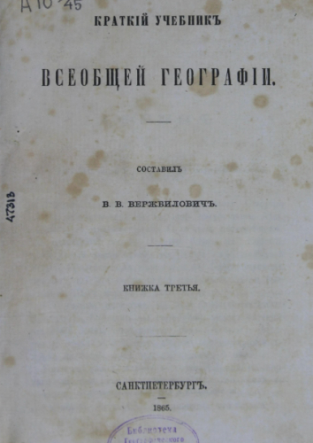 Вержбилович, Валерий Валерьянович (1813?-1865). Краткий учебник всеобщей географии. Кн. 3. / сост. В.В. Вержбилович. - Санкт-Петербург : Тип. В. Безобразова и комп., 1865