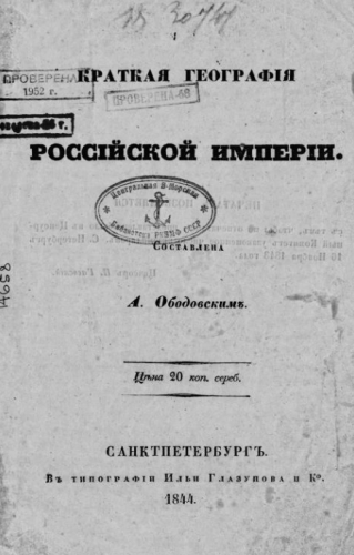 Ободовский, Александр Григорьевич (1796-1852). Краткая география Российской империи / сост. А. Ободовским. - Санкт-Петербург : Тип. Ильи Глазунова и Ко, 1844