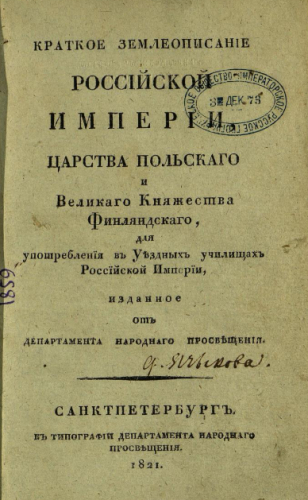 Зябловский, Евдоким Филиппович (1764-1846). Краткое землеописание Российской империи, Царства Польского и Великого княжества Финляндского : для употребления в уездных училищах Российской империи / изд. от Департамента народного просвещения. - Санкт-Петербург : Тип. Департ. народного просвещения, 1821