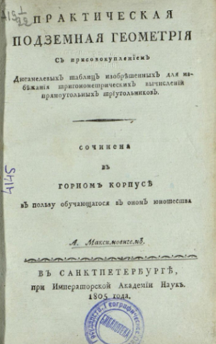 Максимович, Алексей Иванович (1772-1852). Практическая подземная геометрия : С присовокуплением Дюгамелевых таблиц изобретенных для избежания тригонометрических вычислений прямоугольных треугольников / Соч. в Горном корпусе в пользу обучающегося в оном юношества А. Максимовичем. - Санкт-Петербург : При Имп. Акад. наук, 1805