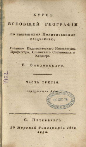 Зябловский, Евдоким Филиппович (1763-1846). Курс всеобщей географии по нынешнему политическому разделению. Ч. 3 : Содержащая Азию / Гл. Педагогического ин-та проф., статского советника и кавалера Е. Зябловского. - Санкт-Петербург : Мор. тип., 1819
