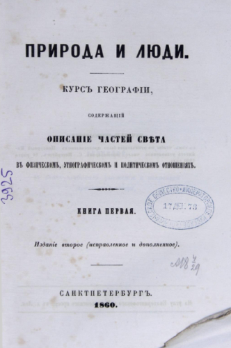 Павловский, Аркадий Ильич (1828-1889). Природа и люди : курс географии, содержащий описание частей света в физическом, этнографическом и политическом отношениях. Кн. 1, Вып. 1-2 : [Океания. Австралия. Африка]. - 2-е изд., испр. и доп. - Санкт-Петербург : Тип. П.А. Кулиша, 1860