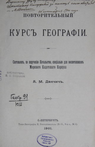 Данчич, Арсений Михайлович. Повторительный курс географии / сост. по поруч. нач. спец. для восп. Мор. кадет. корпуса А.М. Данчич. - Санкт-Петербург : Типо-лит. К. Биркенфельда, 1901