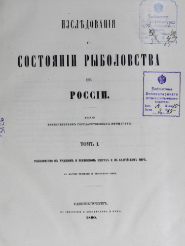 Исследования о состоянии рыболовства в России. Т. 1 : Рыболовство в Чудском и Псковском озерах и в Балтийском море / изд. Мин-вом гос. имуществ. - Санкт-Петербург : Тип. В. Безобразова и комп., 1860