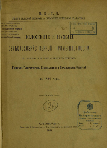 Положение и нужды сельскохозяйственной промышленности на основании всеподданнейших отчетов генерал-губернаторов, губернаторов и начальников областей за 1894 г. / М.З. и Г.И. Отд. сельской экономии и сельхоз. статистики. - Санкт-Петербург : Тип. В. Киршбаума, 1898