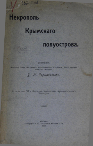 Чернопятов, Виктор Ильич (1857-1935). Некрополь Крымского полуострова / сост. член Моск. археол. ин-та, член разных учен. о-в В.И. Чернопятов. - Москва : Тип. Л.В. Пожидаевой, 1910 - (Отд. оттиск: Записки Моск. археол. ин-та. Т. 11)