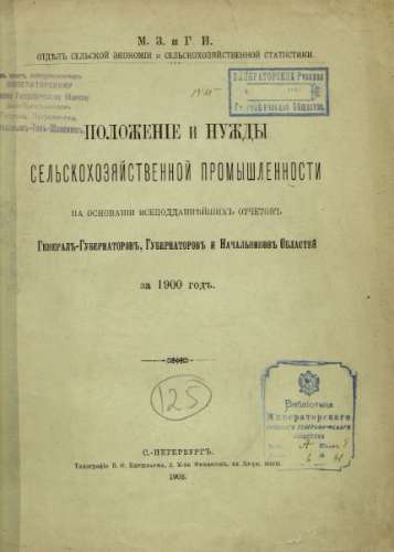 Положение и нужды сельскохозяйственной промышленности на основании всеподданнейших отчетов генерал-губернаторов, губернаторов и начальников областей за 1900 год / М.З. и Г.И. Отд. сельской экономии и сельхоз. статистики. - Санкт-Петербург : Тип. В.Ф. Киршбаума, 1903