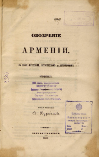 Худобашев, Александр Макарович (1780-1862). Обозрение Армении, в географическом, историческом и литературном отношениях / собр. и сост. А. Худабашев. - Санкт-Петербург : Тип. 2-го Отд. Собств. е.и.в. канцелярии, 1859
