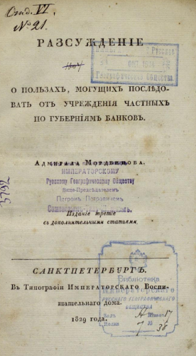 Мордвинов, Николай Семенович (1754-1845). Рассуждение о пользах, могущих последовать от учреждения частных по губерниям банков / [Соч.] адмирала Мордвинова. - 3-е изд., доп. - Санкт-Петербург : Тип. Имп. Воспитательного дома, 1829