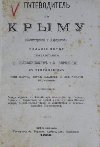 Сосногорова, Мария Александровна (1820?-1891). Путеводитель по Крыму / [соч.] (Сосногоровой и Караулова) ; перераб. Н. Головкинским и К. Вернером. - 5-е изд., перераб. - Москва : Тип. бр. Вернер, 1889