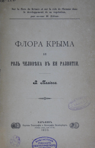 Талиев, Валерий Иванович (1872-1932). Флора Крыма и роль человека в ее развитии / [соч.] В. Талиева. - Харьков : Пар. тип. и лит. Зильберберг, 1900 - (Отд. оттиск: Труды О-ва испытателей природы при Имп. Харьк. ун-те. Т. 35)