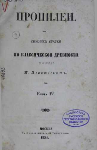 Пропилеи : Сборник статей по классической древности. Кн. 4. / изд. П. Леонтьевым - Москва : Универ. тип., 1854