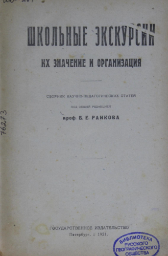 Школьные экскурсии, их значение и организация : Сб. науч.-пед. ст. / под общ. ред. Б.Е. Райкова. - Петербург : Госиздат, 1921