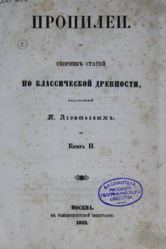 Пропилеи : Сборник статей по классической древности. Кн. 2. / изд. П. Леонтьевым - Москва : Универ. тип., 1852