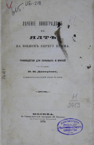 Дмитриев, Владимир Николаевич (1839-1904). Лечение виноградом в Ялте на Южном берегу Крыма : руководство для больных и врачей / сост. В.Н. Дмитриев, вольнопрактикующий врач в Ялте. - Москва : Универ. тип. (М. Катков), 1878