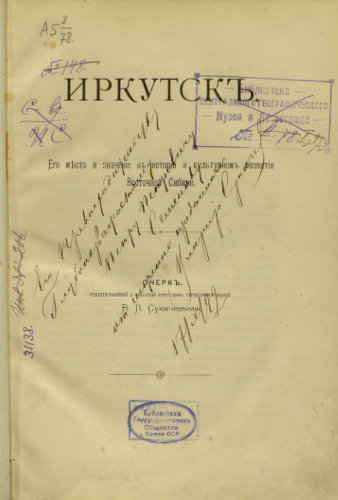 Иркутск : Его место и значение в истории и культурном развитии Восточной Сибири : очерк / ред. и изд. иркут. гор. головой В.П. Сукачевым. - Москва : Типо-лит. т-ва И.Н. Кушнерев и К°, 1891