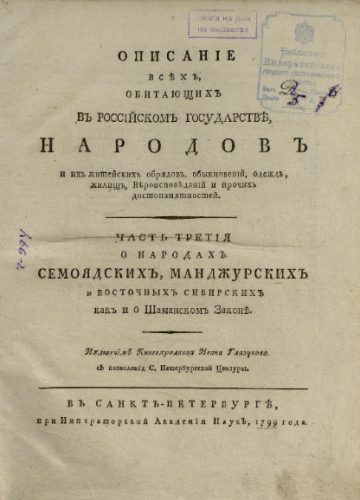 Георги, Иоганн Готлиб (1729-1802). Описание всех обитающих в Российском государстве народов их житейских обрядов, обыкновений, одежд, жилищ, упражнений, забав, вероисповеданий и других достопамятностей. Ч. 3-4. / иждивением книгопродавца Ивана Глазунова. - Санкт-Петербург : При Имп. Акад. наук, 1799
