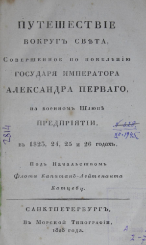 Коцебу, Отто Евстафьевич (1788-1846). Путешествие вокруг света, совершенное по повелению государя императора Александра Первого, на военном шлюпе Предприятии, в 1823, 24, 25 и 26 годах, под начальством Флота капитан-лейтенанта Коцебу. - Санкт-Петербург : Мор. тип., 1828