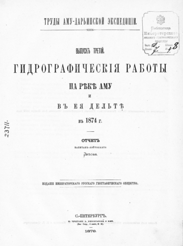 Труды Аму-Дарьинской экспедиции. Вып. 3 : Гидрографические работы на реке Аму и ее дельте в 1874 г. : отчет кап.-лейт. Зубова. - Санкт-Петербург, 1878 (2013). - [6], 32 с., 3 л. черт., карт