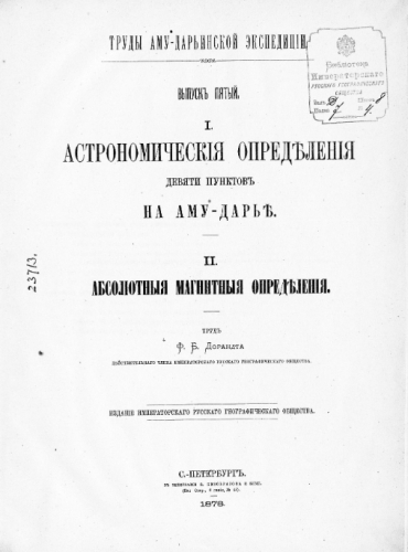 Труды Аму-Дарьинской экспедиции. Вып. 5 : 1. Астрономические определения девяти пунктов на Аму-Дарье ; 2. Абсолютные магнитные определения : труд Ф.Б. Дорандта, д. чл. Рус. геогр. о-ва. - Санкт-Петербург : Имп. Рус. геогр. о-во, 1878 (2013). - [4], 29 с.