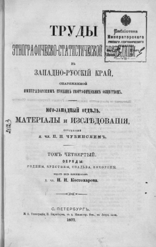Труды Этнографическо-статистической экспедиции в Западно-русский край, снаряженной Императорским Русским географическим обществом. Юго-западный отдел : Материалы и исслед., собр. д. чл. П.П. Чубинским. Т. 4 : Обряды: родины, крестины, свадьба, похороны / изд. под набл. действ. чл. Н.И. Костомарова. - С.-Петербург, 1877