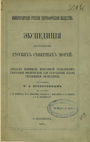 Доклад Комиссии по снаряжению экспедиции в северные моря / сост. П. А. Кропоткиным, секретарем Отд-ния географии физ. Имп. Рус. геогр. о-ва при содействии А. И. Воейкова, М. А. Рыкачева [и др.]. - С.-Петербург, 1871